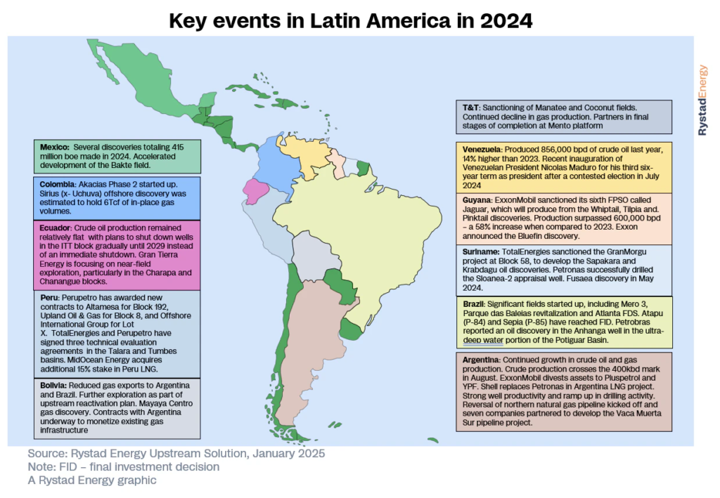En 2024, los perforadores de la región descubrieron alrededor de 1.200 millones de barriles de petróleo equivalente de recursos, más de un 20 % menos que los recursos descubiertos en 2023 y mucho más bajos que los niveles históricos promedio. Guyana siguió liderando la región en términos de volúmenes descubiertos gracias al éxito continuo de ExxonMobil en el bloque Stabroek. México también tuvo un buen éxito en la exploración. Los perforadores encontraron 415 millones de barriles de petróleo equivalente de recursos distribuidos en varios descubrimientos, a pesar de los desafíos que plantearon las importantes empresas como Shell y Petronas, que redujeron sus operaciones tras notables fracasos en la exploración.