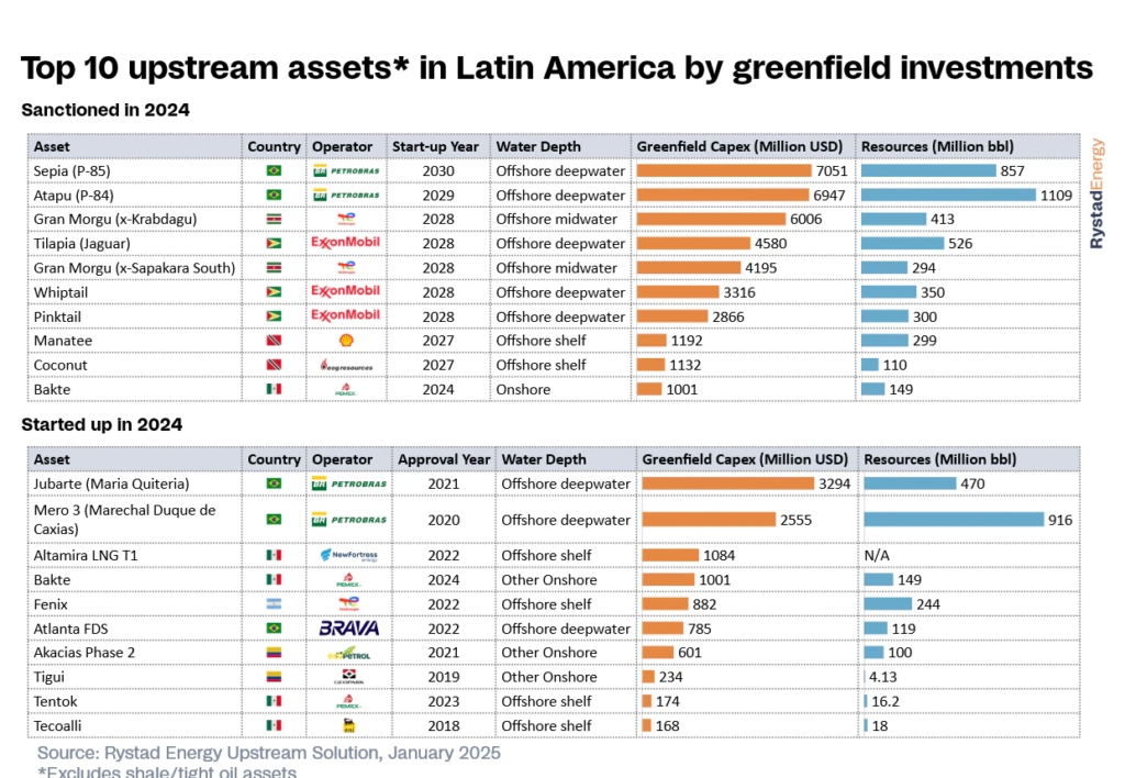 El año pasado se aprobaron nuevos proyectos por un valor de casi 39.000 millones de dólares, impulsados por Brasil, Guyana y Surinam en el segmento offshore de aguas profundas a medias. En mayo de 2024, Petrobras y sus socios aprobaron la segunda fase de los campos Sepia y Atapu, cada uno con una nueva unidad FPSO.
