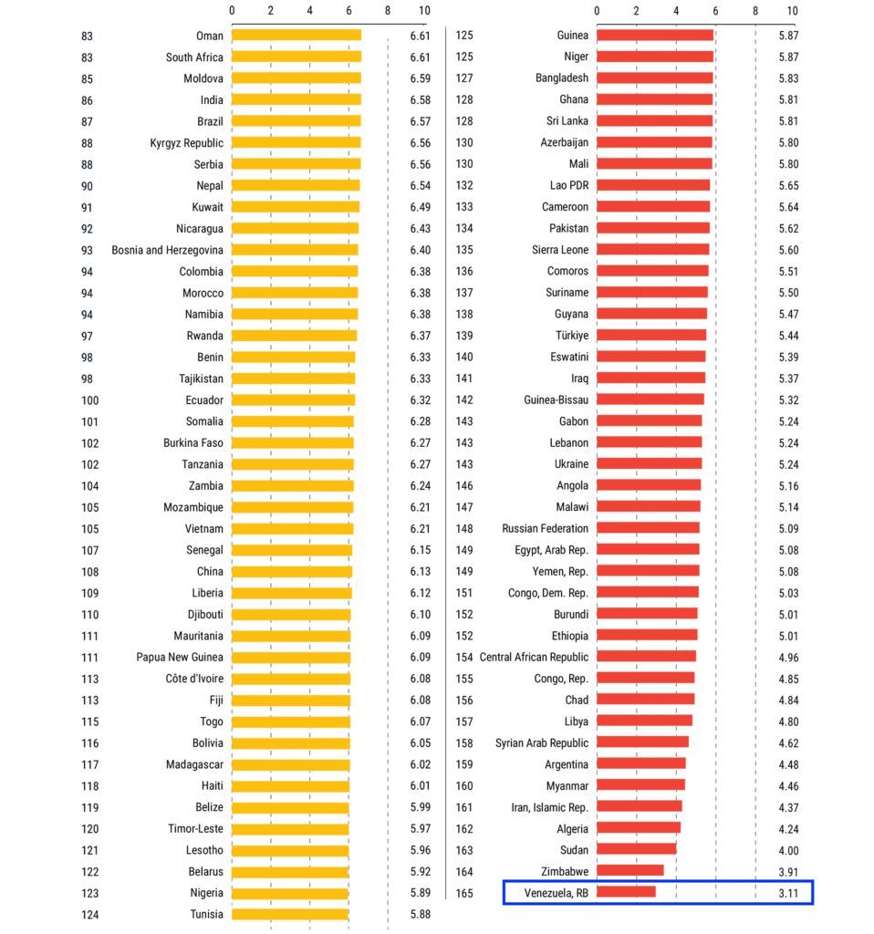 En esta ocasión, Venezuela volvió a ocupar el último puesto del índice (165), alcanzando un puntaje de 3.11 sobre 10. Además, el estudio resalta que el desafío urgente para la economía está asociado con el fortalecimiento de la moneda, dado que fue el indicador donde el país obtuvo su calificación más baja.