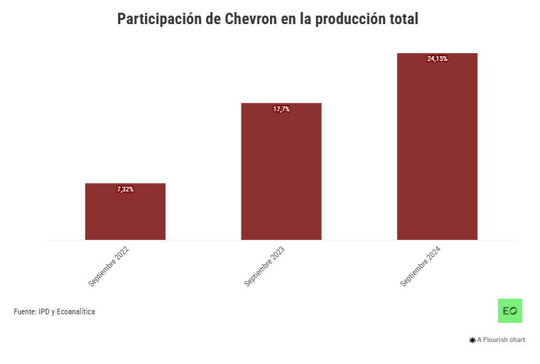 Según las fuentes secundarias que utiliza la OPEP, al cierre de enero de este año, la producción alcanzó 892.000 barriles diarios. Este aumento se debe casi en su totalidad a Chevron, que de acuerdo con la consultora Ecoanalítica, genera 212.000 barriles diarios, es decir, el 24% del total.