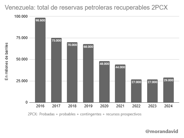 Las reservas de Venezuela pasaron de 98.000 millones de barriles en 2016 a 29.000 millones de barriles en 2024, con un incremento de 2.000 millones de barriles respecto a 2023