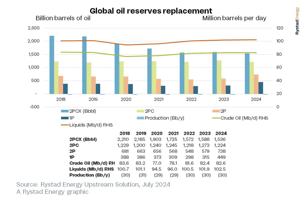 Es así como bajo esta metodología de cuantificación, las reservas petroleras probadas mundiales (1P) pasaron de 388 mil millones de barriles en 2018 a 440 mil millones de barriles en 2024; mientras que las “PCX (probadas + probables + contingentes + prospectivas) pasaron de 2.210 mil millones de barriles cayendo a 1.536 mil millones de barriles en 2024.