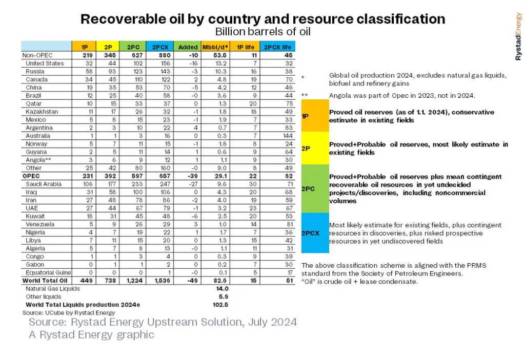 En su más reciente actualización (abril 2024) Rystad calculó las reservas petroleras mundiales por países que totalizan (1P) 449 mil millones de barriles de petróleo