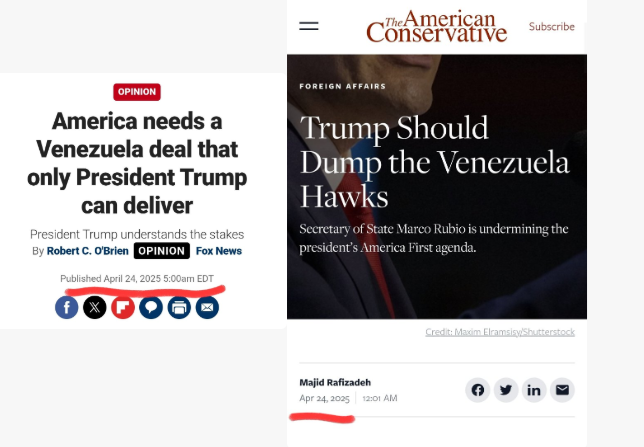5/ El 24 de abril, esta pésima agencia de relaciones públicas publicó otros dos artículos el mismo día, sin ocultar su actividad. Esta vez, en medios más conservadores: Fox News y American Conservative.