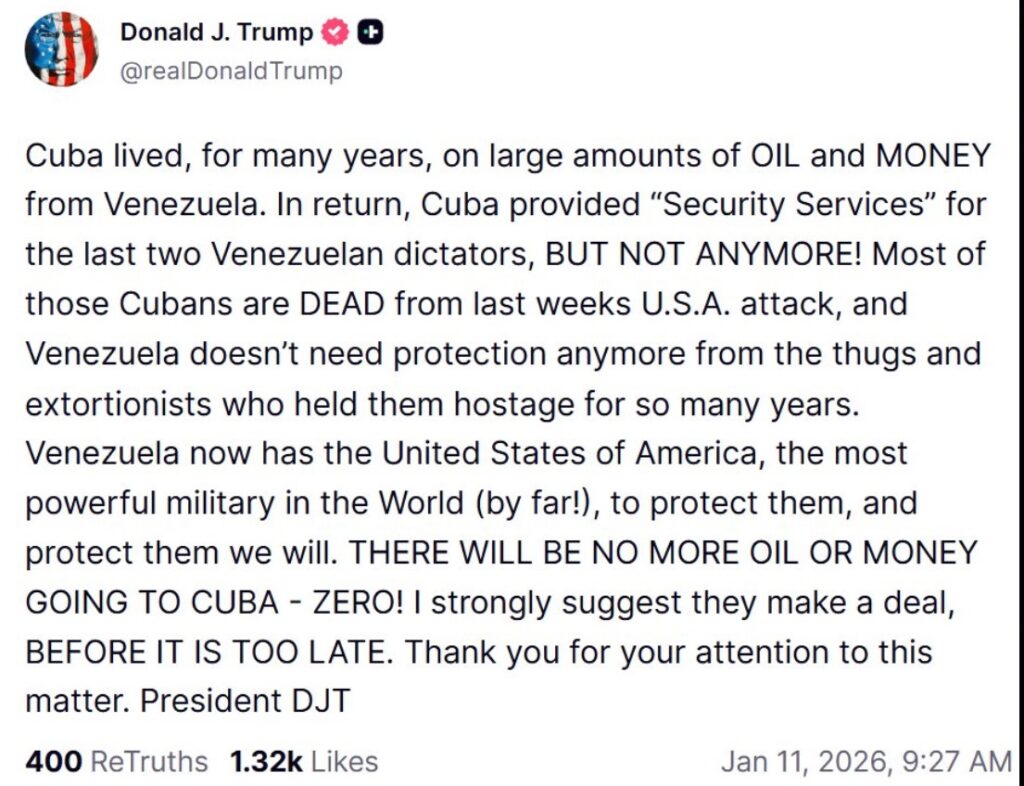 «Cuba sobrevivió durante muchos años gracias al petróleo y el dinero de Venezuela. A cambio, Cuba proporcionó «servicios de seguridad» a los dos últimos dictadores venezolanos, ¡pero ya no! La mayoría de esos cubanos han muerto tras el ataque estadounidense de la semana pasada, y Venezuela ya no necesita protección de los matones y extorsionadores que los mantuvieron secuestrados durante tantos años», escribió Trump en un mensaje publicado en su red social Truth Social.