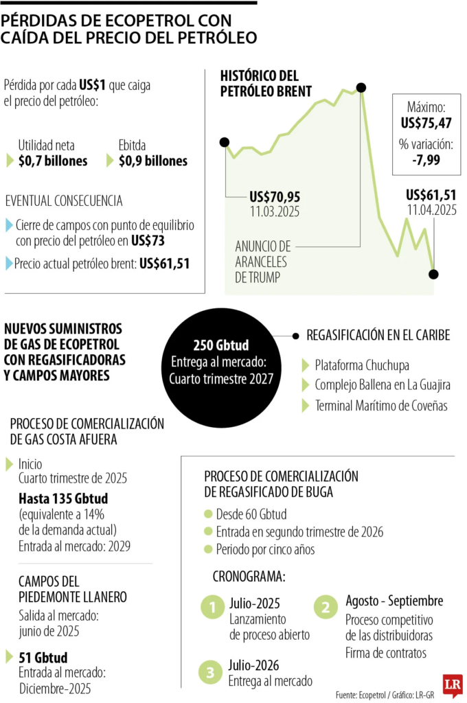 En el último día del Congreso Naturgas, el presidente de Ecopetrol, Ricardo Roa, dejó un mensaje agridulce, por un lado anunció el cronograma de comercialización de gas, pero calculó cuánto puede ser la caída de las utilidades de la compañía con el descenso en el precio del petróleo, luego del anuncio de aranceles del Gobierno de los Estados Unidos. Las afectaciones son tan graves, que esto generará el cierre de algunos campos petroleros.