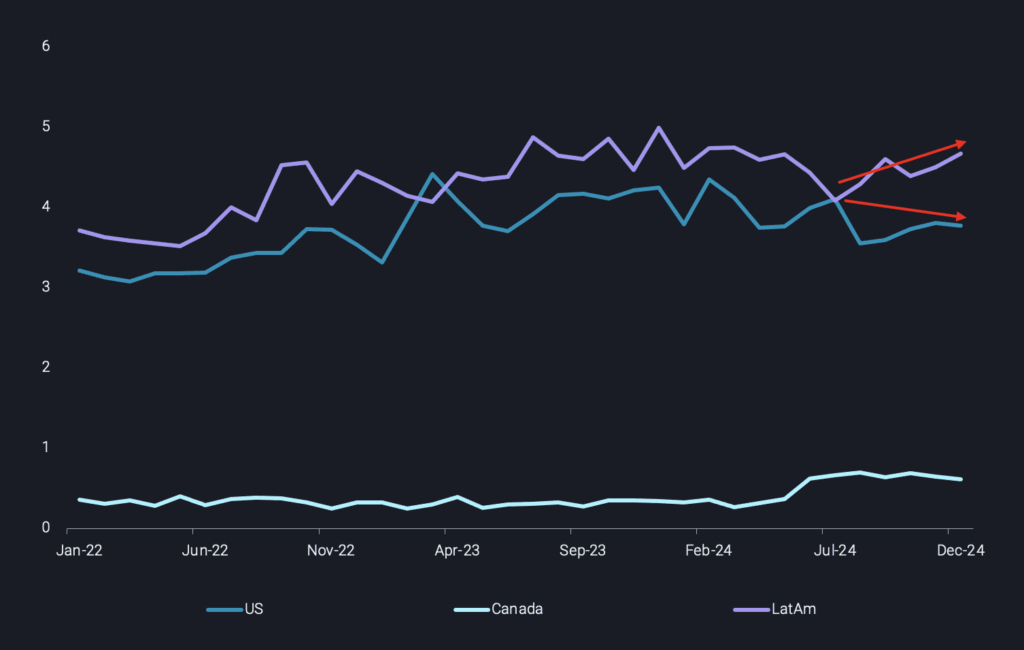 Las caídas de EE. UU. y Canadá se compensan con el crecimiento de América Latina