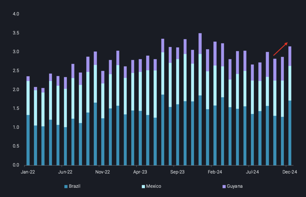 Las exportaciones de crudo de América comenzaron a estancarse durante la segunda mitad de 2024, y Estados Unidos, el mayor exportador, mostró signos de desaceleración. De manera similar, en Canadá, las exportaciones desde Vancouver a través del nuevo oleoducto Trans Mountain Expansion (TMX) también disminuyeron durante dos meses consecutivos a partir de noviembre de 2024. Pero estas disminuciones se compensaron con el aumento de las exportaciones de los países de América Latina, especialmente Brasil y Guyana.