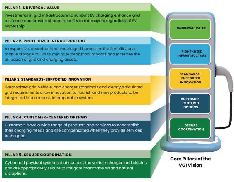 La VGI es mucho más que conectar vehículos a la red para su carga. La implementación exitosa de la VGI alinea perfectamente la infraestructura física y la estructura operativa de la red, los marcos regulatorios y el diseño del mercado con los comportamientos de carga de los clientes. Esto crea una relación simbiótica que beneficia a todos, independientemente de quién sea el propietario del vehículo eléctrico. La visión del DOE para la VGI se sustenta en cinco pilares: valor universal, infraestructura de tamaño adecuado, innovación respaldada por estándares, opciones centradas en el cliente y coordinación segura.