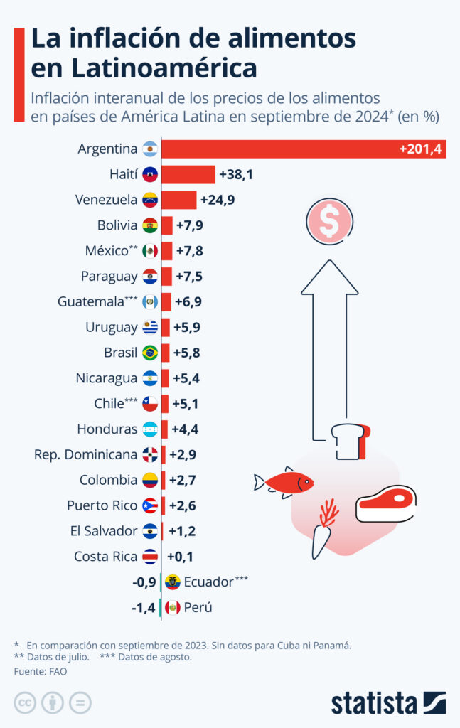 Según datos de la Organización de las Naciones Unidas para la Agricultura y la Alimentación (FAO), Argentina es el país de América Latina que tuvo más inflación interanual de los precios de los alimentos en septiembre de 2024 (comparados con el mismo mes de 2023) con el 201,4%.