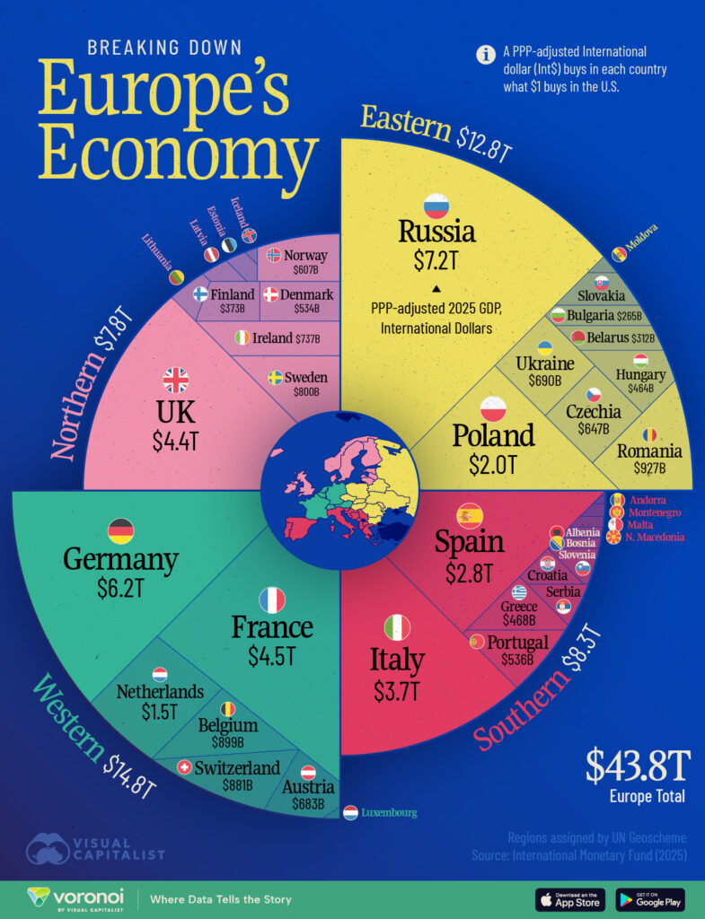 La visualización desglosa el producto ajustado a la paridad de poder adquisitivo (PPA) en 2025 , mostrando cómo las diferentes partes de Europa contribuyen a la riqueza colectiva del continente.