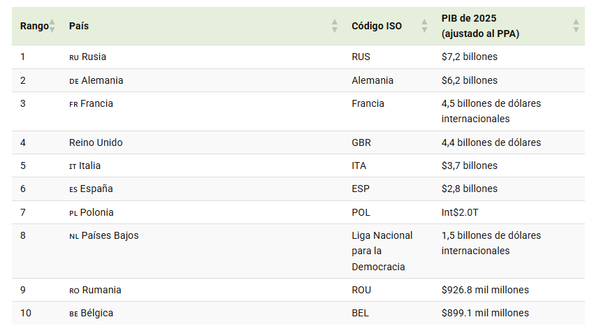 PIB de los países europeos en 2025, ajustado al coste de la vida