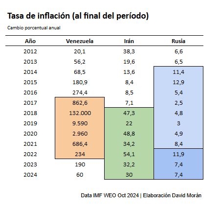 Rusia controla su inflación (8%) con superávits fiscales y reservas de divisas (600 mil millones de dólares), mientras Irán (30%) limita la monetización del déficit. Venezuela, en cambio, sigue financiando gasto público insostenible con impresión de dinero.