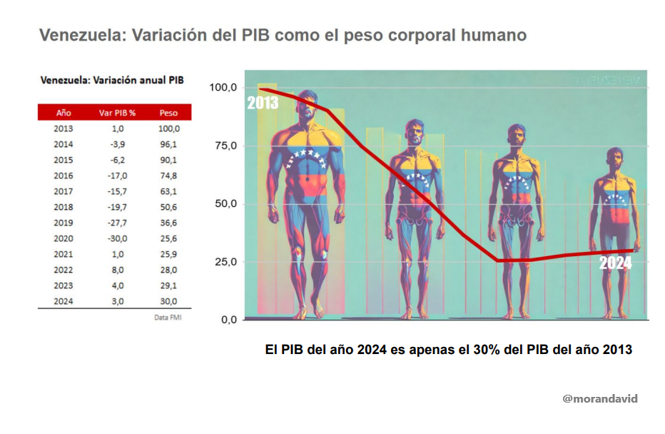 Uso la analogía del peso corporal de un humano para ilustrar la destrucción de la capacidad productiva del país que mide el PIB. Si en 2013 el peso de ese hombre fue de 100 kilogramos, en 2024 terminó con un peso de apenas 30 kilos, el peso de un muchacho, o de un hombre sometido en un campo de concentración.