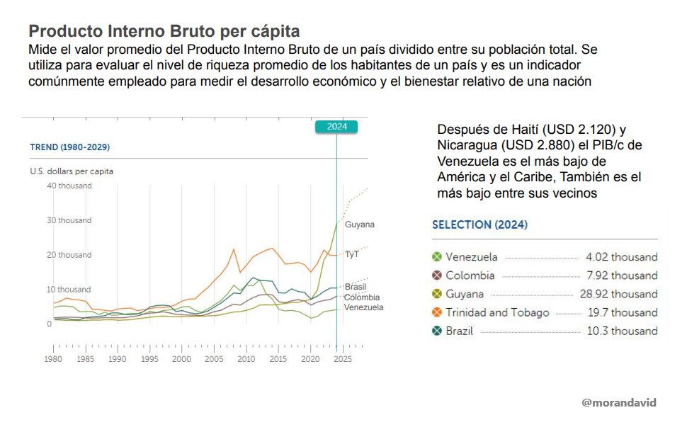 Sin embargo, el crecimiento reciente no compensa las pérdidas acumuladas: el PIB actual es un tercio del de 2012, y el PIB per cápita está al nivel de 1999, ubicándose en 2024 en 4.020 dólares per cápita, el tercero más bajo en el continente americano y el caribe, después de Haití y Nicaragua