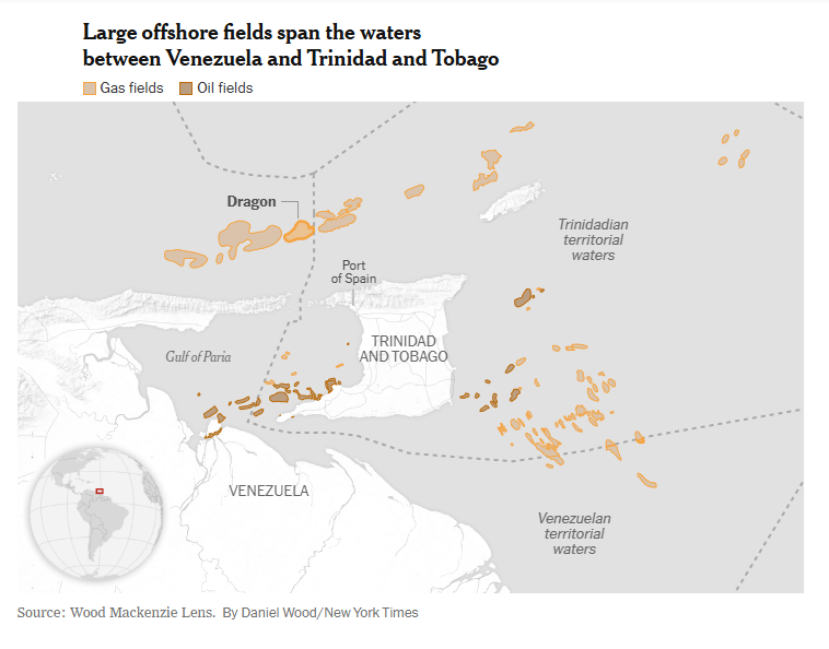 Dragón, un gigantesco yacimiento de gas que debe su nombre a las agitadas aguas que dividen Venezuela de Trinidad, se encuentra entre los más próximos a ser explotados. Hace muchos años, Venezuela intentó recuperar el gas enterrado allí antes de quedarse sin dinero, un esfuerzo desafortunado que se vio interrumpido por el hundimiento de una plataforma de exploración en 2010.