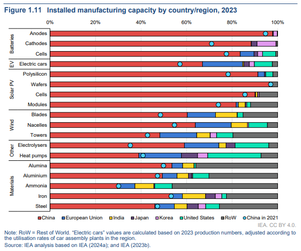 Pero más seguro no significa completamente seguro: el nuevo sistema comercial trae consigo nuevos riesgos. Uno de ellos es el dominio chino. China alberga al menos el 60% de la capacidad manufacturera mundial en 10 de los 13 productos cubiertos por el informe de la AIE [Figura 1.11].