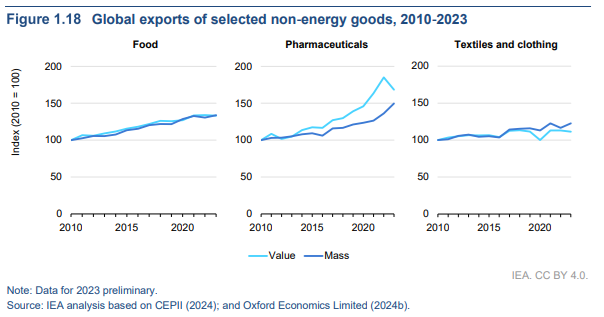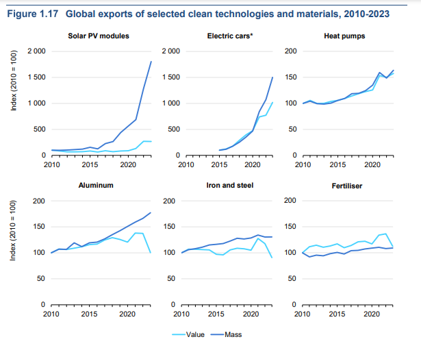 Un nuevo informe de la Agencia Internacional de la Energía (AIE) ofrece la visión más completa hasta el momento del panorama global emergente. El informe rastrea la producción y el comercio internacional de paneles solares, vehículos eléctricos (VE), turbinas eólicas, bombas de calor y electrolizadores de hidrógeno, así como los componentes clave que los componen, como las baterías de los VE. El comercio de VE, por ejemplo, se multiplicó por veinte entre 2015 y 2023, mientras que el de paneles solares se multiplicó por diez entre 2010 y 2023. [Figura 1.17] Estas tasas superan ampliamente las de otras industrias. [Figura 1.18]