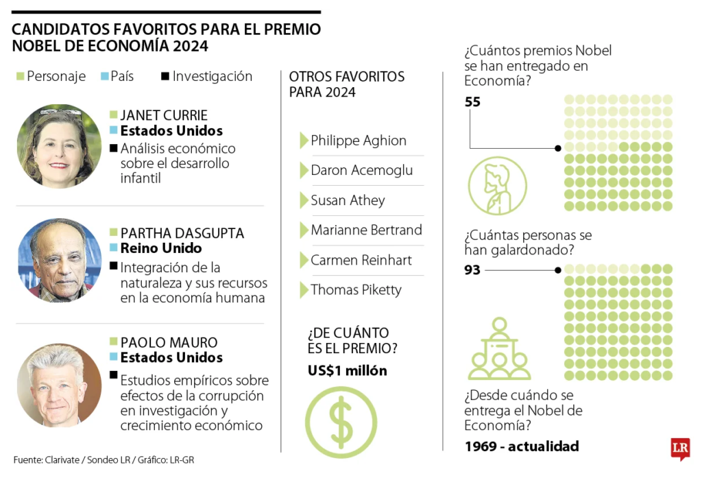 De acuerdo con el listado que elabora esta consultora, que reconoce los autores más citados con categoría Nobel, la condecoración estaría entre Partha Dasgupta, Janet Currie y Paolo Mauro. Para ganar el reconocimiento, aseguran analistas, su teoría económica debe ser aplicable a la vida diaria.