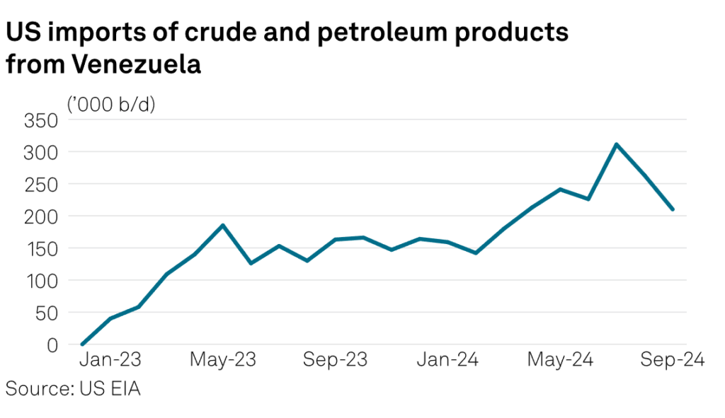 El crudo venezolano es una buena opción para las refinerías estadounidenses, especialmente en la costa del Golfo de Estados Unidos. Estados Unidos importó un promedio de 216.000 b/d de petróleo crudo y productos derivados del petróleo en 2024 hasta septiembre, según datos de la EIA estadounidense.