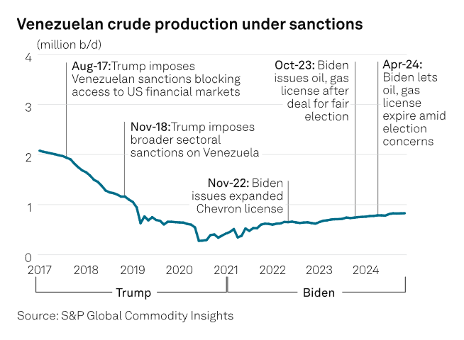 Los analistas de S&P Global Commodity Insights esperan que Trump cancele todas las licencias, excepto la de Chevron. «Tenemos una producción promedio de 806.000 b/d en 2024, que se mantendrá sin cambios en 806.000 b/d en 2025 y disminuirá a 784.000 b/d en 2026», según este escenario, dijo Nick Blanco, analista de investigación sénior de Commodity Insights.