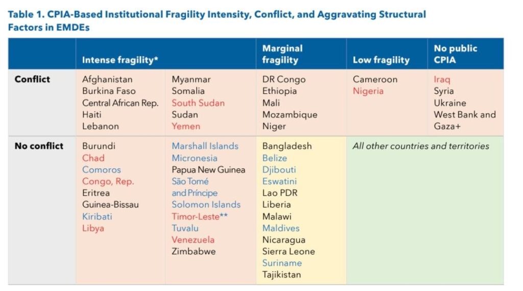 El Fondo Monetario Internacional (FMI) clasificó recientemente a Venezuela como un Estado bajo «Intensa Fragilidad» (Intense Fragility), dentro de su categoría de Estados Frágiles y Afectados por Conflictos (FCS, por sus siglas en inglés).