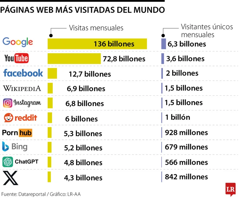 De acuerdo con los datos más recientes de Datareportal, Google encabeza el listado como el sitio web más visitado del mundo, registrando 136 billones de visitas mensuales y 6,3 billones de visitantes únicos. Esta cifra casi duplica la cantidad de visitas de su más cercano competidor y supera por diez veces a quienes ocupan los puestos siguientes.