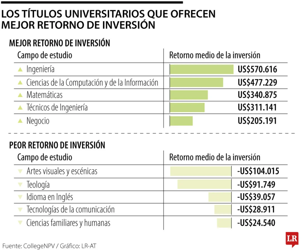 El campo que lidera el ranking es ingeniería, con un retorno medio de la inversión de US$570.616. A este le sigue las ciencias de la computación y de la información con un retorno medio de US$477.229. Y en tercer puesto aparece el campo de matemáticas con US$340.875. El top cinco lo complementa técnicos de ingeniería con US$311.141 y negocio con US$205.191.