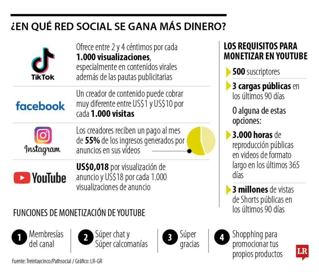 Para los creadores de contenido es una buena opción, sin embargo, al parecer no es la mejor. “YouTube es la red social más lucrativa para los creadores de contenido por todo el tema de monetización en función a las vistas y anuncios que tenga un video”, aseguró Andrés Amarís, experto en marketing digital. Hay que tener en cuenta que los pagos también dependen de la región en la que se encuentre. No genera las mismas ganancias un creador de contenido de Europa que uno de Sudamérica.