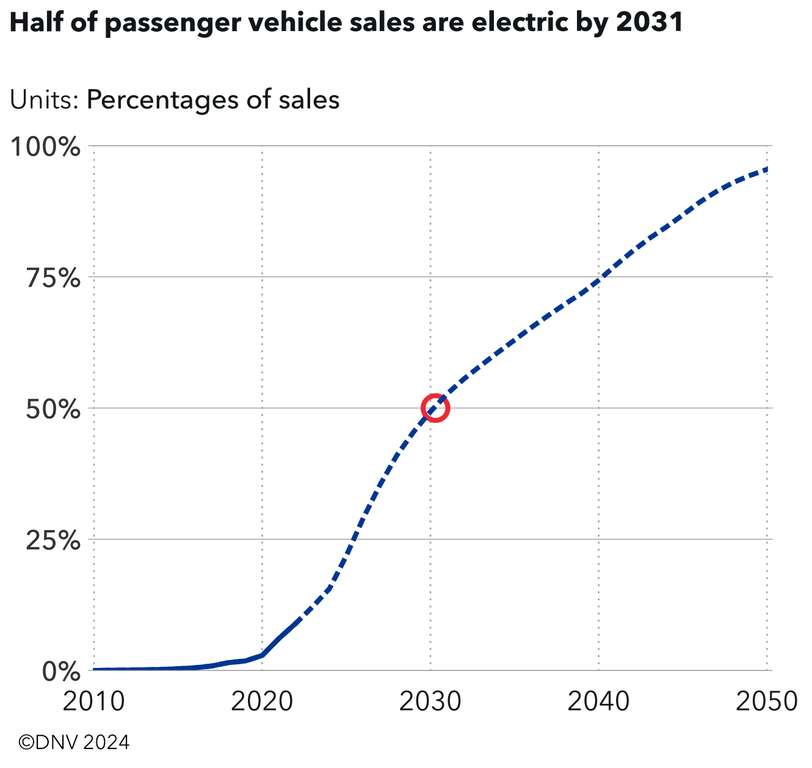 • Las ventas de vehículos eléctricos aumentaron un 50% el año pasado y están en camino de alcanzar una participación del 50% en las ventas globales de vehículos eléctricos de pasajeros en 2031.