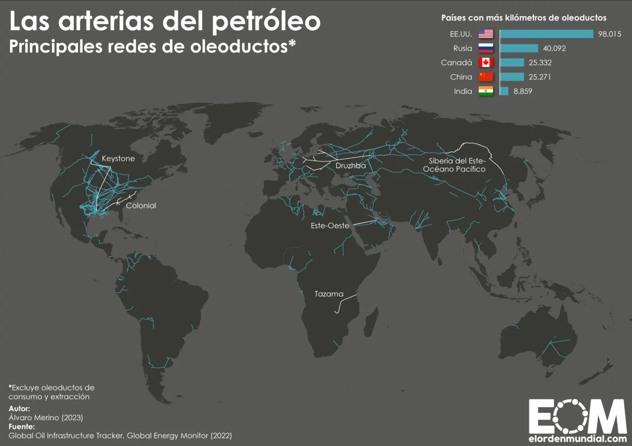 En la actualidad, la red global de oleoductos en activo suma un total de 306.580 kilómetros, según datos del Global Energy Monitor, aunque esa cifra incluye solo las tuberías de larga distancia o de transmisión y no las de distribución a hogares y empresas ni las de extracción, las puramente industriales. Estados Unidos, el mayor productor de petróleo del mundo con una cuota del 20%, es el país con mayor cantidad de oleoductos de transmisión del mundo con 83.303 kilómetros, seguido de otros grandes productores con amplias superficies territoriales como Rusia (47.298), China (28.613) o Canadá (24.572).
