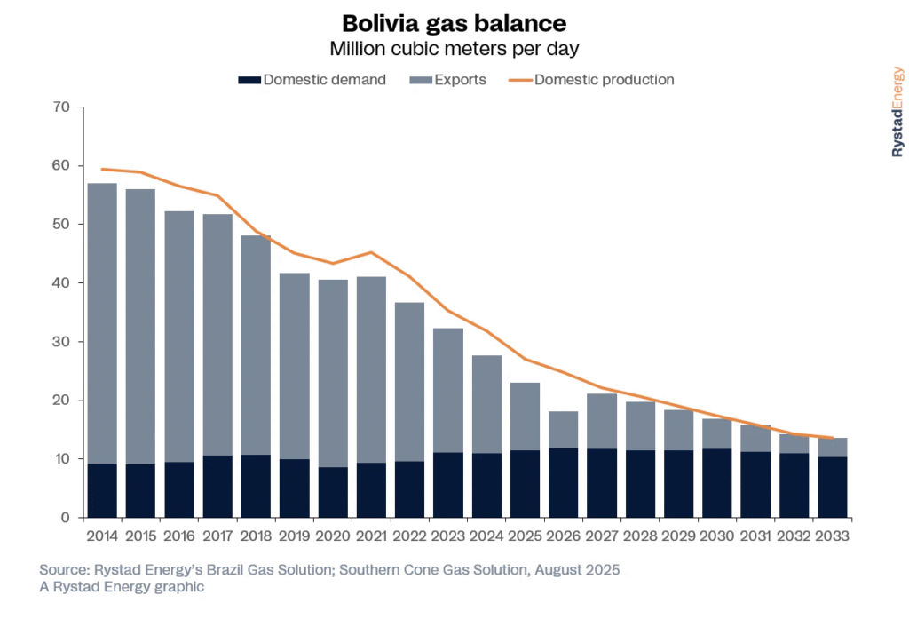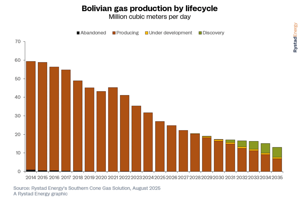 a primera vuelta de las elecciones presidenciales bolivianas se celebró el 17 de agosto, con el izquierdista Movimiento al Socialismo (MAS) sufriendo una derrota histórica tras casi dos décadas en el poder. El candidato del MAS, Eduardo del Castillo, obtuvo apenas un 3% de los votos, mientras que el derechista Quiroga obtuvo el 27% y el centrista Paz, el 32%. La segunda vuelta está programada para el 19 de octubre, y es probable que el cambio de rumbo del prolongado dominio del MAS marque el inicio de una nueva era en la política energética del país. Podría alterar el rumbo de la industria del gas y sus relaciones con países vecinos, como Argentina y Brasil.