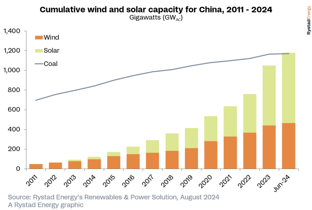 Este cambio se debe a un énfasis creciente en fuentes de energía más limpias y un alejamiento de los combustibles fósiles para el país. A pesar de la ventaja inicial del carbón, con alrededor de 50 GW de instalaciones anuales antes de 2016, China ha realizado inversiones sustanciales para expandir su infraestructura de energía renovable. Desde 2020, las instalaciones anuales de energía eólica y solar han superado constantemente los 100 GW, tres a cuatro veces la capacidad agregada para el carbón. Este impulso solo ha cobrado impulso desde entonces, y el año pasado China estableció un récord con 293 GW de instalaciones eólicas y solares, impulsadas por proyectos de centros renovables a escala de gigavatios de los primeros y segundos lotes de la NEA conectados a la red del país.