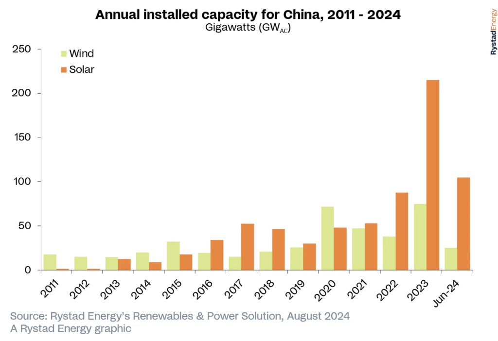 La energía eólica se introdujo en China a principios de la década de 2000 como la primera fuente de energía nueva del país, y la ampliación de la capacidad de energía eólica se aceleró durante la década siguiente. En 2011, el país tenía 17,6 GW de nueva capacidad eólica terrestre instalada. Las instalaciones eólicas crecieron de manera constante entre 2011 y 2019, añadiendo entre 15 GW y 30 GW de nueva capacidad cada año, y los desarrollos eólicos marinos se incorporaron a la combinación energética del país desde 2018. En 2020, hubo un aumento notable, con un récord de 71 GW de nuevas instalaciones, impulsado por la urgencia de asegurar tarifas de alimentación y subsidios antes de que la nación los eliminara gradualmente. El aumento fue seguido por una caída inmediata, y luego las instalaciones disminuyeron durante los dos años siguientes. Sin embargo, la capacidad eólica se recuperó el año pasado con 75 GW de nuevas incorporaciones, impulsadas por el desarrollo acelerado de proyectos para cumplir con los objetivos nacionales para 2025. En la primera mitad de este año, se agregaron 25 GW de nueva capacidad, y las estimaciones de Rystad Energy predicen 50 GW adicionales en la segunda mitad del año.