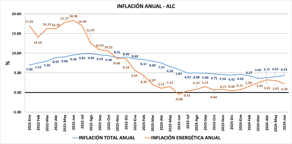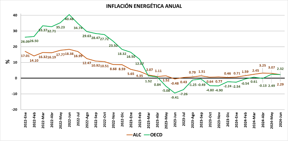 La inflación energética anual de América Latina y el Caribe, en junio de 2024 (respecto a junio de 2023) fue de 2.29%. Esta tasa es inferior a la inflación total (4.33%). Cabe notar que desde octubre de 2022 los precios del sector energía en la región siguen estando por debajo de los precios de la economía regional en su conjunto.