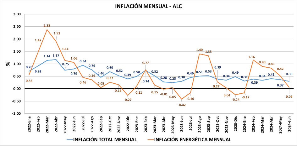 En el mes de junio de 2024, la inflación energética regional alcanzó un valor de 0.06% lo que la sitúa, por primera vez este año, incluso por debajo de la inflación total mensual de la región de 0.3%.