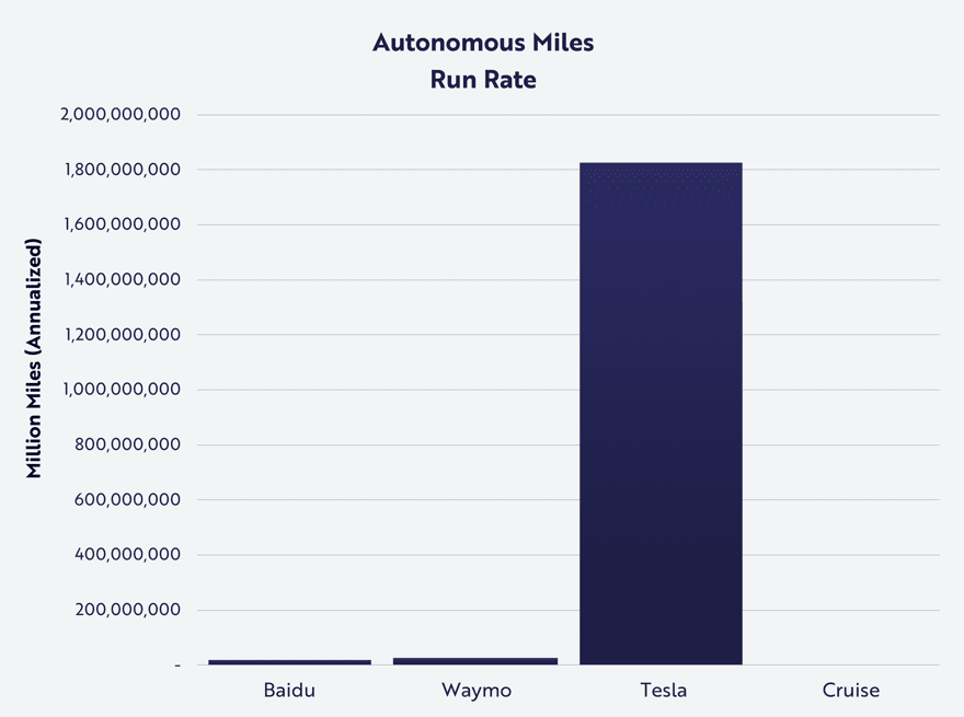 Si bien Waymo y Baidu son los primeros en lanzarse al mercado en operaciones de robotaxi, como se muestra en el primer gráfico a continuación, nuestra investigación sugiere que Tesla está entrenando su sistema autónomo con aproximadamente 70 veces más datos, como se muestra en el segundo gráfico a continuación. Como será el caso con la mayoría de los proyectos de IA (inteligencia artificial), es probable que la ventaja de escala de datos de Tesla conduzca al dominio comercial en esta oportunidad en la que «el ganador se lleva la mayor parte».