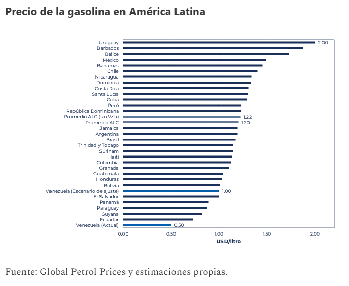 Si la dinámica de ajustes iniciada con el plan piloto para gasolina premium en Venezuela, en donde se espera aumentar el combustible a un 1 $/litro, se llegará a masificar y establecerse como el precio oficial del combustible —lo que implicaría un incremento cercano al 100% sobre el precio actual de referencia—, la gasolina nacional seguiría ubicándose entre las más baratas de la región y por debajo del promedio latinoamericano. Esto evidencia que el país opera aún bajo un esquema de precios energéticos —también en el deficiente servicio eléctrico— significativamente distorsionado frente a sus pares regionales. Y esa ‘brecha’ con los precios regionales no tiene un efecto neutro, sino que mantiene incidencias fiscales, para las empresas y para los consumidores.