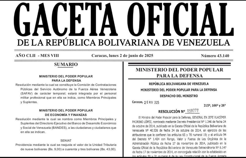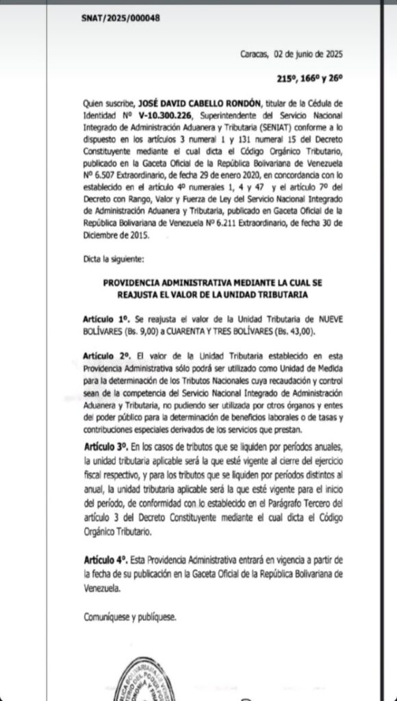 En Gaceta Oficial Número 43.140, de fecha 2 de junio de 2025, fue publicada la resolución del Servicio Nacional Integrado de Administración Aduanera y Tributaria (Seniat), en la cual se reajusta el valor de la Unidad Tributaria (UT) de Bs. 9 a Bs. 43, lo que representa el 377.78%