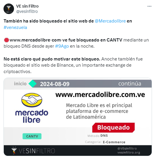 La dirección www.mercadolibre.com.ve fue bloqueada en la red de CANTV, mediante un bloqueo DNS que comenzó la noche del 9 de agosto.