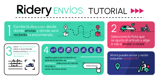 A partir de ahora, los usuarios de Ridery podrán enviar y recibir encomiendas de manera segura y rápida, gracias al nuevo servicio: Ridery Envíos. Diferentes flotas están disponibles en todo momento para hacer tus encomiendas, con tarifas a partir de $1.6 podrás escoger entre motos, carros, camionetas y pick up.