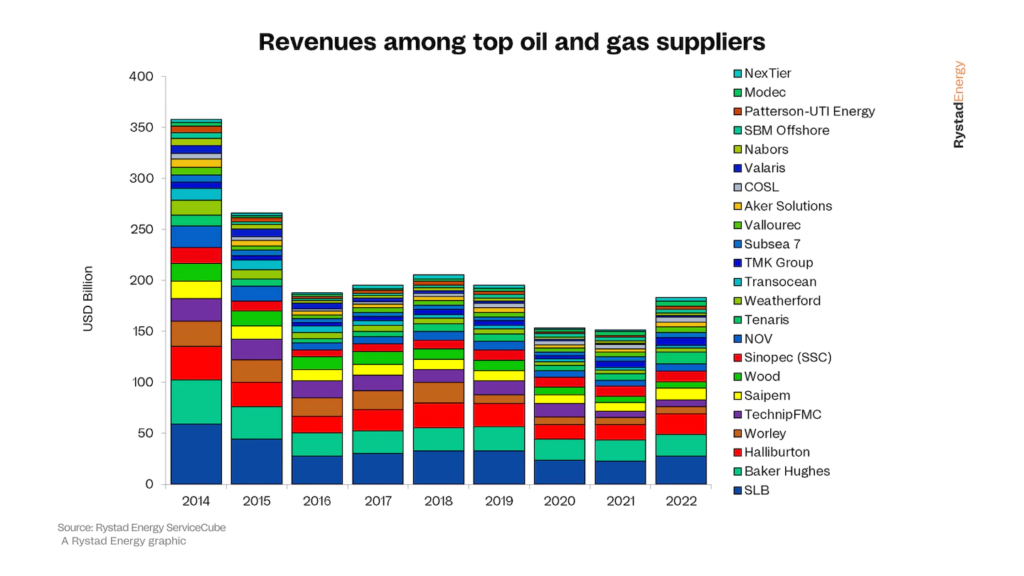 Desde su punto máximo en 2014 hasta su punto más bajo en 2021, los ingresos cayeron casi un 60 % para los contratistas más grandes. A pesar de cierto optimismo en 2017-19, el mercado realmente no despegó ya que los productores de petróleo y gas mantuvieron una estricta disciplina de efectivo y algunos segmentos en la cadena de suministro de petróleo y gas lucharon con un exceso de capacidad continuo.