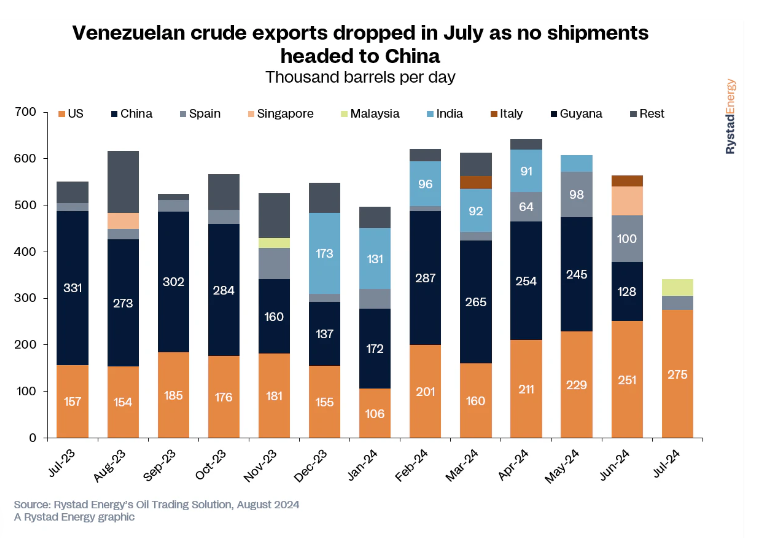 Las exportaciones de Venezuela disminuyeron en más de 230.000 bpd en julio debido a la disminución de las exportaciones a China. Las interrupciones en ciertas unidades de mezcla y procesamiento que procesan la producción de la faja del Orinoco provocaron la falta de disponibilidad de crudo diluido y mayores demoras en la carga de cargamentos y exportaciones en julio. Las elecciones celebradas en el país durante el período también afectaron negativamente las exportaciones, ya que las exportaciones de julio promediaron solo 340.000 bpd. Estados Unidos, China y España fueron los mayores consumidores de barriles venezolanos en el segundo trimestre de 2024.