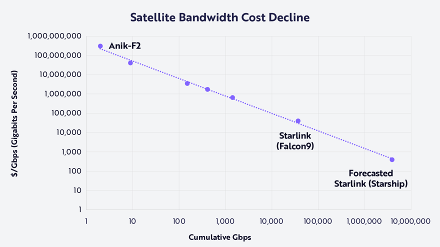 Desde 2004, el costo del ancho de banda por satélite se ha multiplicado por 7.500, pasando de $300.000.000 a $40.000/Gigabits por segundo (Gbps). Gracias a Starship, los costos podrían reducirse otras 40 veces hasta ~1.000 $/Gbps en 2028. Dado que 1 Gbps puede dar servicio a 200 clientes con un coste de capital de ~1.000 $/Gbps, SpaceX podría recuperar su inversión en Starship con un cargo único de 5 $ por cliente.