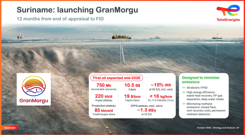 El proyecto incluye una unidad flotante de producción, almacenamiento y descarga (FPSO) de 220.000 barriles de petróleo por día, que replica un diseño probado y eficiente. La inversión total se estima en alrededor de 10.500 millones de dólares y se espera que la primera producción de petróleo se realice en 2028. La FPSO de GranMorgu está diseñada para dar cabida a futuras oportunidades de conexión que ampliarían su meseta de producción.