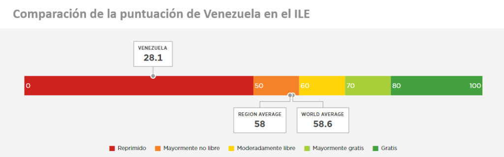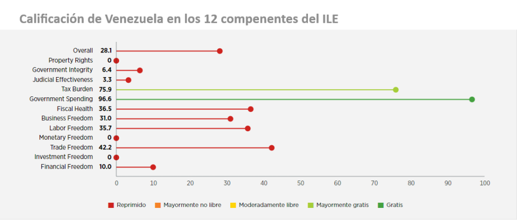 En cuanto a la calificación de Venezuela en los 12 componentes del ILE, el país obtuvo cero puntos en Derechos de Propiedad Libertad Monetaria y Libertad de Inversión