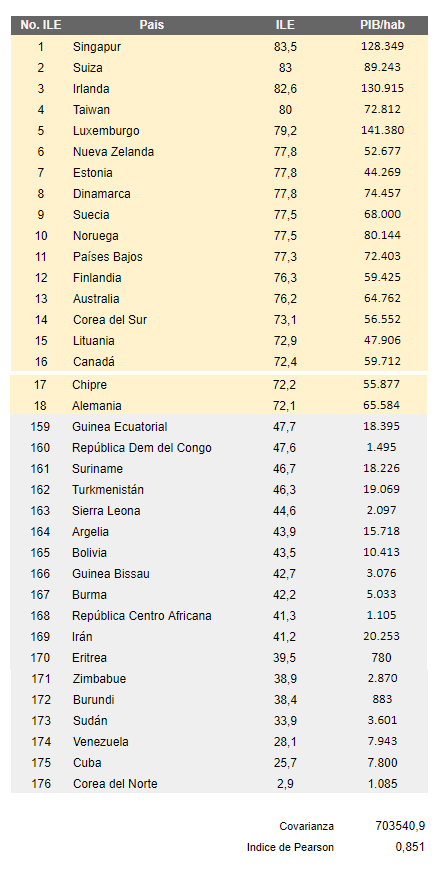 Se observa claramente los dos cluster, el inferior a la izquierda, los países con menor ILE donde el de mayor PIB/hab fue Irán con 20.253 dólares por habitante (se indica Venezuela con 7.943 dólares por habitante y Cuba con 7.800 dólares por habitante). Mientras que en el cluster de países con mayor ILE, el de menor PIB/hab fue Estonia con 44.269 dólares/hab y los de mayores fueron Irlanda con 130.915 y Singapur con 128.349 dólares/hab respectivamente. (ver tabla detallada el final del artículo)