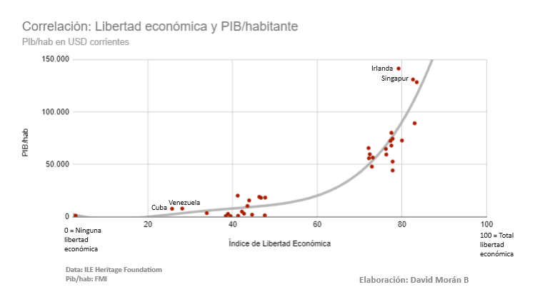 Para demostrar la correlación entre libertad económica y riqueza, tome de los 176 países analizados en el ILE una muestra de 36 de ellos (20% del total) compuesta por los primeros 18 países en el ranking del ILE y los últimos 18, con la idea de identificar claramente en un gráfico los dos clusters de datos que forman cada uno de los grupos. Simplificando así su visualización sin otros datos intermedios para su mejor comprensión. Los valores del PIB per cápita (o por habitante) fueron tomados de la data del Fondo Monetario Internacional a dólares corrientes para el año 2023
