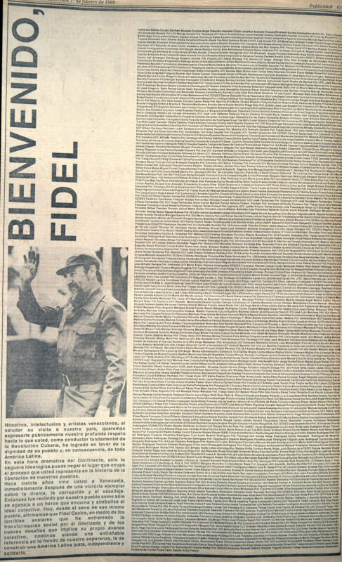 El 1 de febrero del año 1989 en el diario El Nacional de Caracas los venezolanos leímos un manifiesto firmado por 911 intelectuales y artistas, (así se calificaron) para darle la bienvenida a un connotado y muy sui generis dictador que desde que, liderando con su título de comandante (auto otorgado) del ejército rebelde, el brazo armado del Movimiento 26 de julio, tomó el total control del gobierno y de todas las instituciones de la República de Cuba, él, su hermano Raúl, el che Guevara, Ramiro Valdés, Camilo Cienfuegos y Hubert Matos por citar algunos quienes acompañados de otros pandilleros (pandilleros porque así se han comportado con su pueblo durante más de 65 años) disfrazados de revolucionarios, que en el ya lejano año 1958 y hasta el día de hoy no han cesado de vejar, mancillar y torturar a ese noble pueblo, el heredero de José Martí.