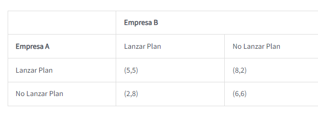 Este pronóstico sugiere que, aunque ambas empresas podrían obtener mayores ganancias si cooperaran y no lanzaran los planes (6, 6), la competencia y la falta de confianza mutua las llevarán a una situación donde ambas lanzan los planes, obteniendo menos beneficios, pero evitando el peor escenario individual.